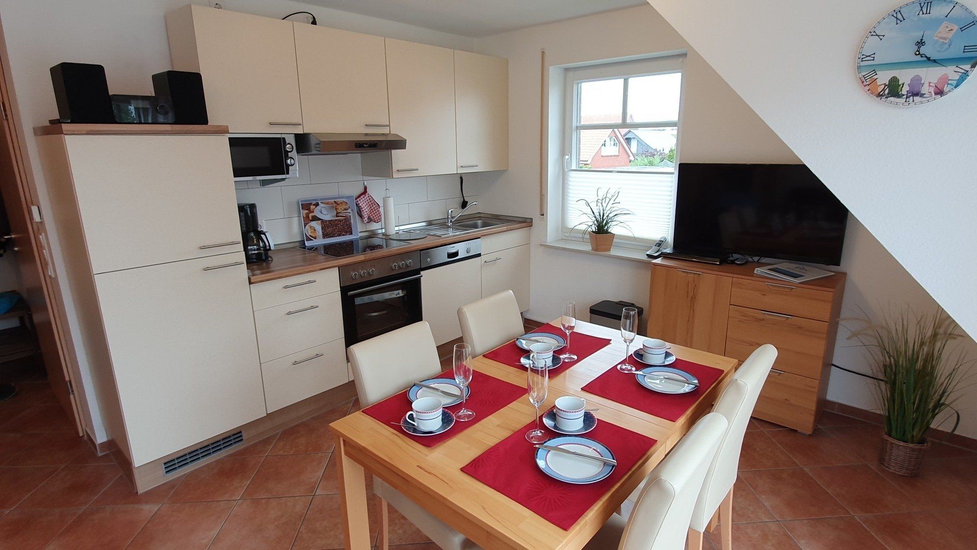 Die Komfort-Einbauküche verfügt über einen Herd mit Cerankochfeld, Umluftbackofen, Spülmaschine, Kühlschrank mit Gefrierfach, Toaster, Kaffeemaschine, "Senseo"-Maschine, Wasserkocher, Eierkocher, Mixer, ausreichend Geschirr, und allen notwendigen Küchenutensilien.