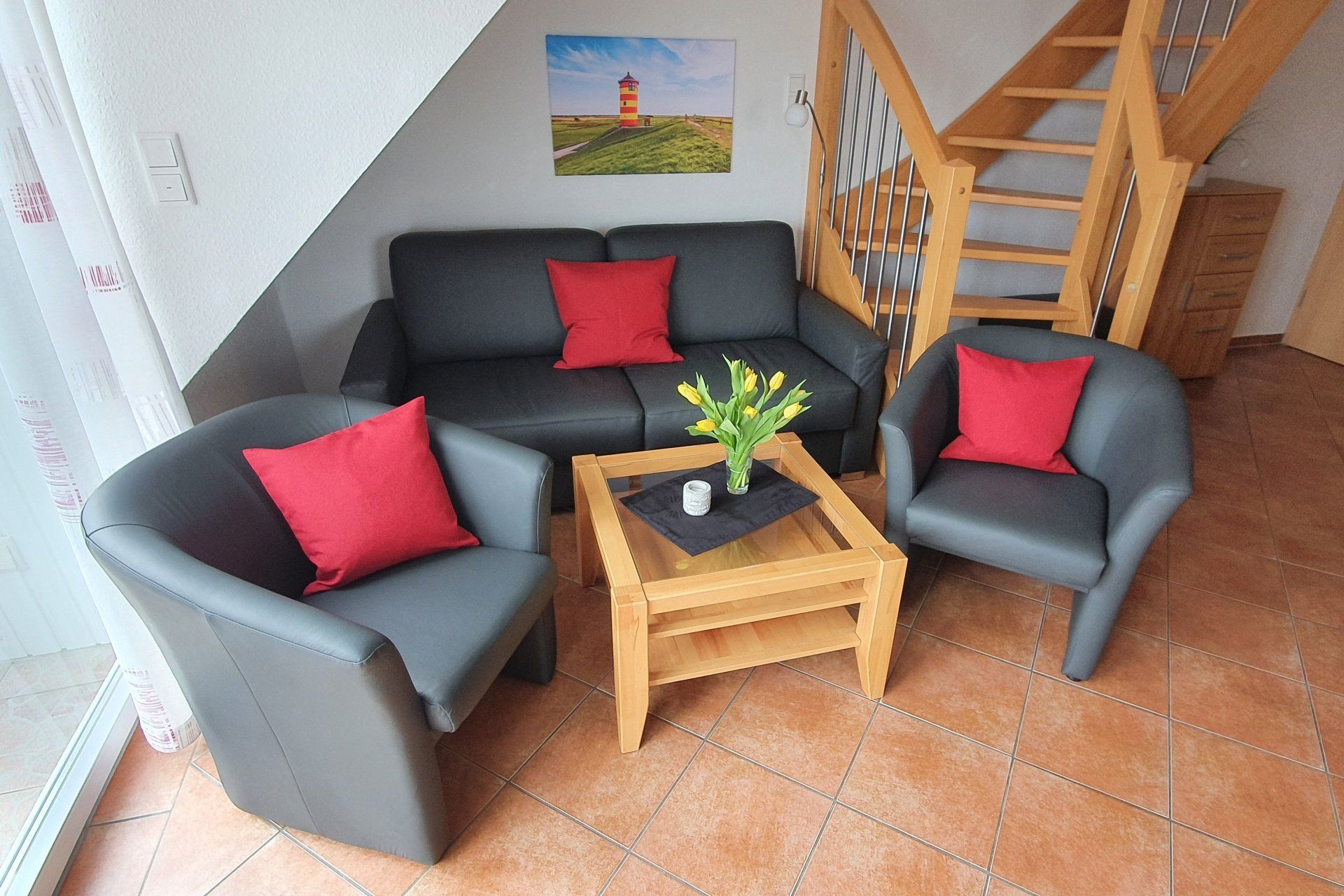 Gemütlich eingerichtet, mit Sofa und zwei Sesseln.